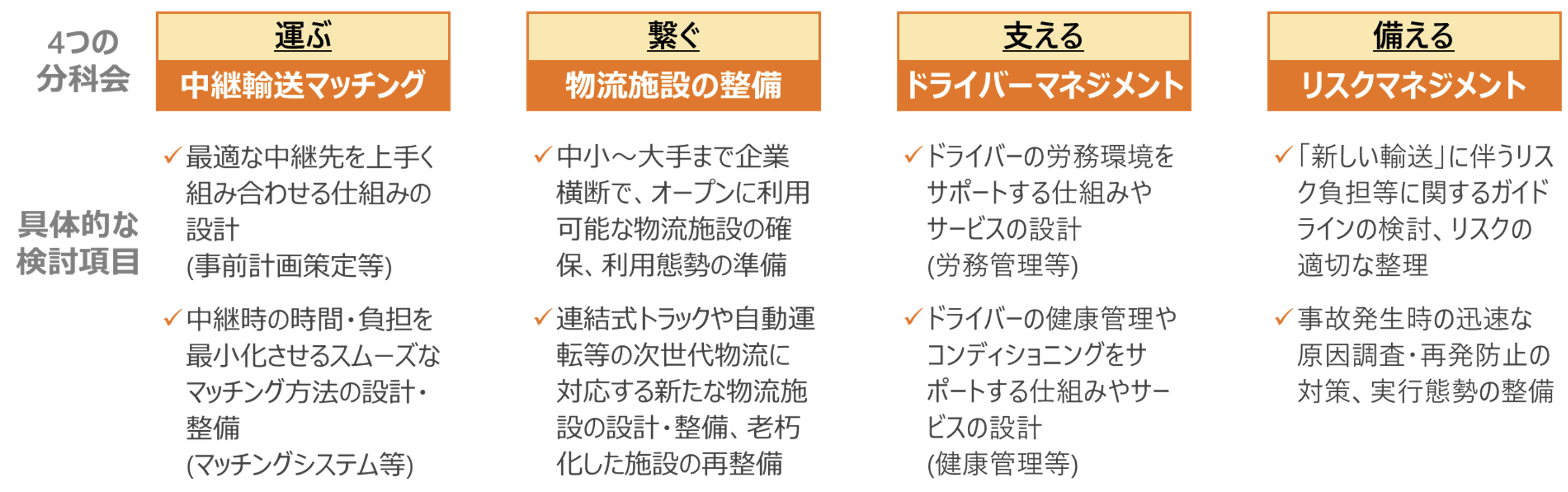 また、中継輸送に次ぐ取り組み領域として、ドライバーの労務環境や健康状態の改善を通じ、効率的で持続可能な物流の構築を目指します。これらの実現に向けて、4つの分科会活動を本格的に稼働させ、企業や業界を超えた価値共創に取り組んでまいります。