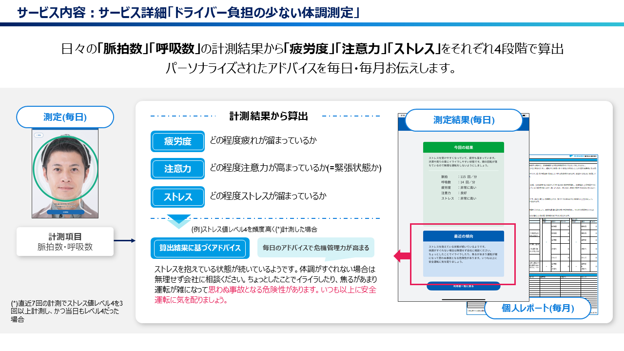 ミマモウェルネスは、AIと非接触バイタルセンシング技術を用いて約10秒でドライバーの状態を可視化し、点呼と一体で“その日のコンディション”を客観的に把握できる健康管理ソリューションです。計測はタブレットを見つめるだけで、脈拍・呼吸数に基づき、疲労度・注意力・ストレスを4段階で算出。結果はその場で表示・アラート化され、管理画面にリアルタイム反映されます。本ソリューションは、経済産業省 ヘルスケア産業課が推進する健康経営推進検討会(2025年3月開催)にて好取組事例として紹介されています。